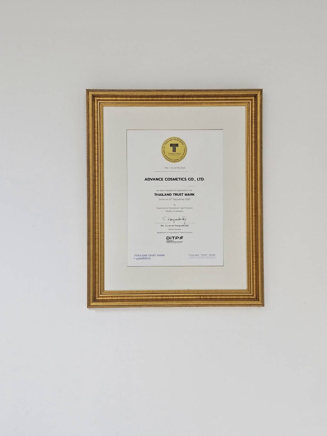 บริษัท แอดว๊านส์ คอสเมติคส์ จำกัด ได้เข้าร่วมงานพิธีมอบประกาศนียบัตร รับตราสัญลักษณ์ Thailandd Trust Mark (T Mark) จากกรมส่งเสริมการค้าระหว่างประเทศ กระทรวงพาณิชย์